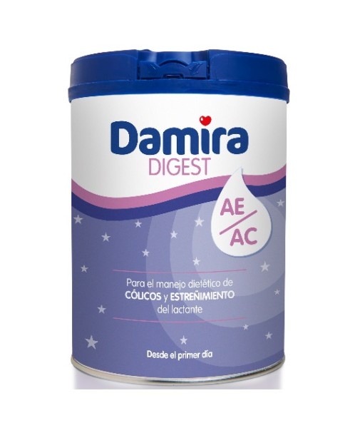 DAMIRA DIGEST es una fórmula infantil indicada para el tratamiento dietético de los cólicos, estreñimiento y trastornos digestivos leves del lactante. Desde el primer día.