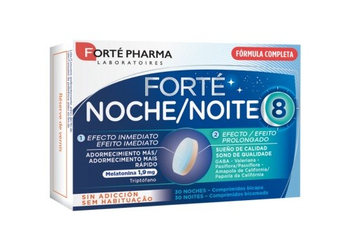 FORTE PHARMA FORTE NOCHE 8 H 30 COMPRIMIDOS BICAPA. Complemento alimenticio a base de melatonina, l-triptófano, extractos de plantas como son la valeriana, la pasiflora, la amapola de california, GABA, vitamina B3 y B6, que ayudan a conciliar y favorecer la relajación y el sueño reparador.