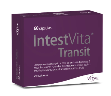 VITAE INTESTVITA TRANSIT 60 CÁPSULAS. Complemento alimenticio a base de enzimas digestivas, 3 cepas bacterianas del intestino humano, espino amarillo, fibra de naranja y FOS que ayuda a regular el tránsito intestinal. Además, contribuye a favorecer la digestión y el funcionamiento normal del intestino, así como a regenerar la flora intestinal beneficiosa.