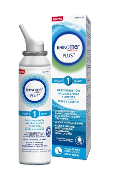 RHINOMER PLUS BEBES Y ADULTOS FUERZA 1 SUAVE  1 SPRAY 125 ML. El agua de mar sale nebulizada permitiendo una limpieza suave pero efectiva de las fosas nasales.