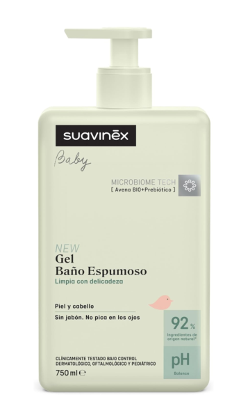 SUAVINEX GEL CHAMPÚ ESPUMOSO 750ML. El gel champú espumoso SUAVINEX limpia y preserva el mato ácido de la piel y el cabello del bebé. Su nueva fórmula contiene un 92% de ingredientes de origen natural.